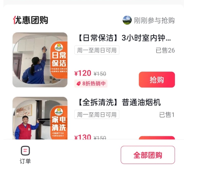抖音團購超方便,刷著視頻就能下單??次覀兊亩兑粢曨l,服務(wù)細節(jié)全知曉,各種優(yōu)惠套餐任你挑,下單一鍵預(yù)約,坐等家政人員上門。